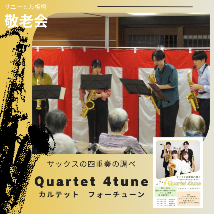お祝い会の後には、ボランティアグループ「Quartet 4tune(カルテット フォーチューン)」の皆様によるサックス演奏が行われ、美しい音色に包まれながら、心温まるひと時を過ごしていただきました。
