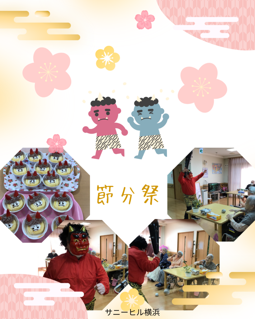 みなさん元気よく、豆の代わりの新聞紙を丸めたボールを赤鬼めがけて「鬼は外!福は内!」終わったあとは、甘納豆と職員手作りの鬼のケーキを召し上がりました。