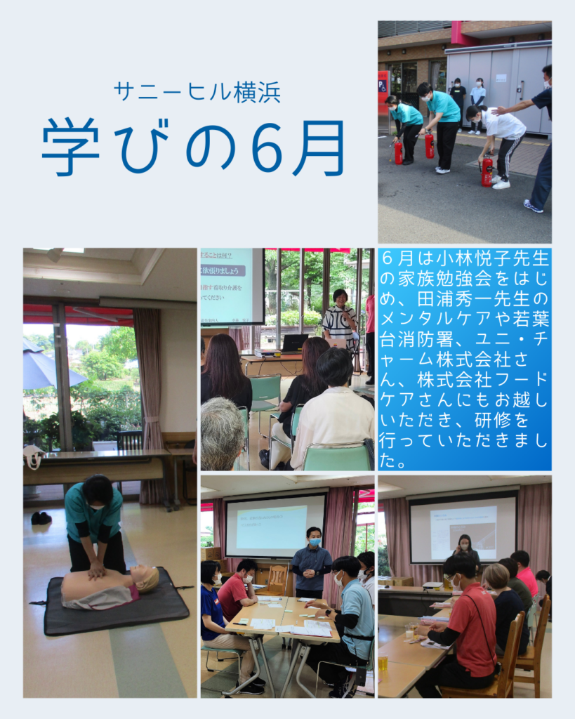 外部講師の方々を招いた研修会をたくさん開催していました。小林先生の看取り介護に関する家族勉強会や田浦先生のメンタルヘルスケア、若葉台消防署の防災訓練など運営基準で定められている研修以外にも、BCPシミュレーション研修や記録の取り方など、年間計画を立てて、職員の自己研鑽にも取り組んでいます。