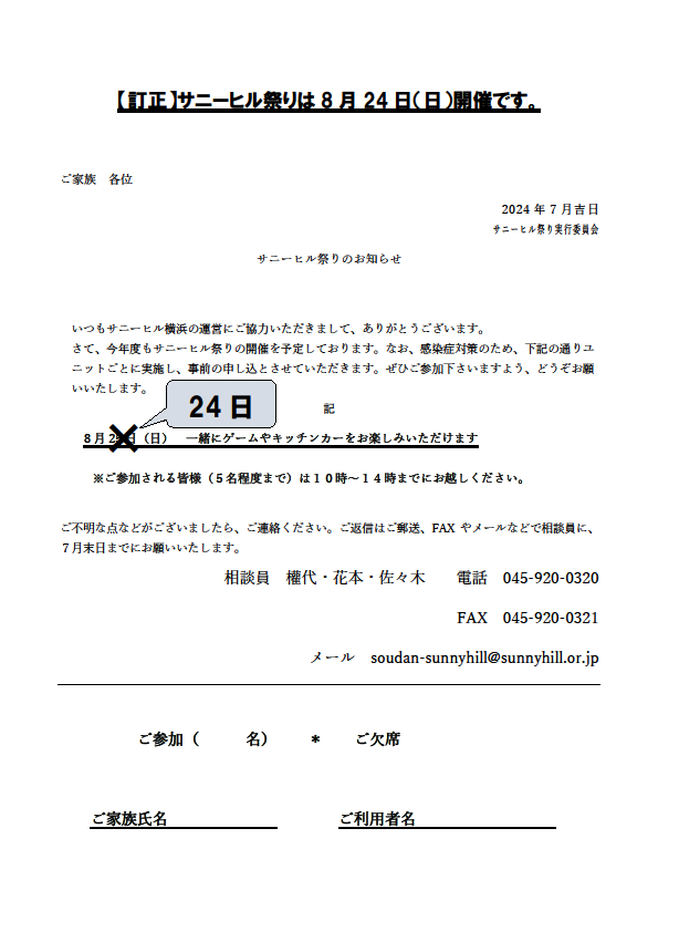 ご入所されている方のご家族等にサニーヒル祭りのお知らせをお送りしておりますが、日時に誤りがございました。